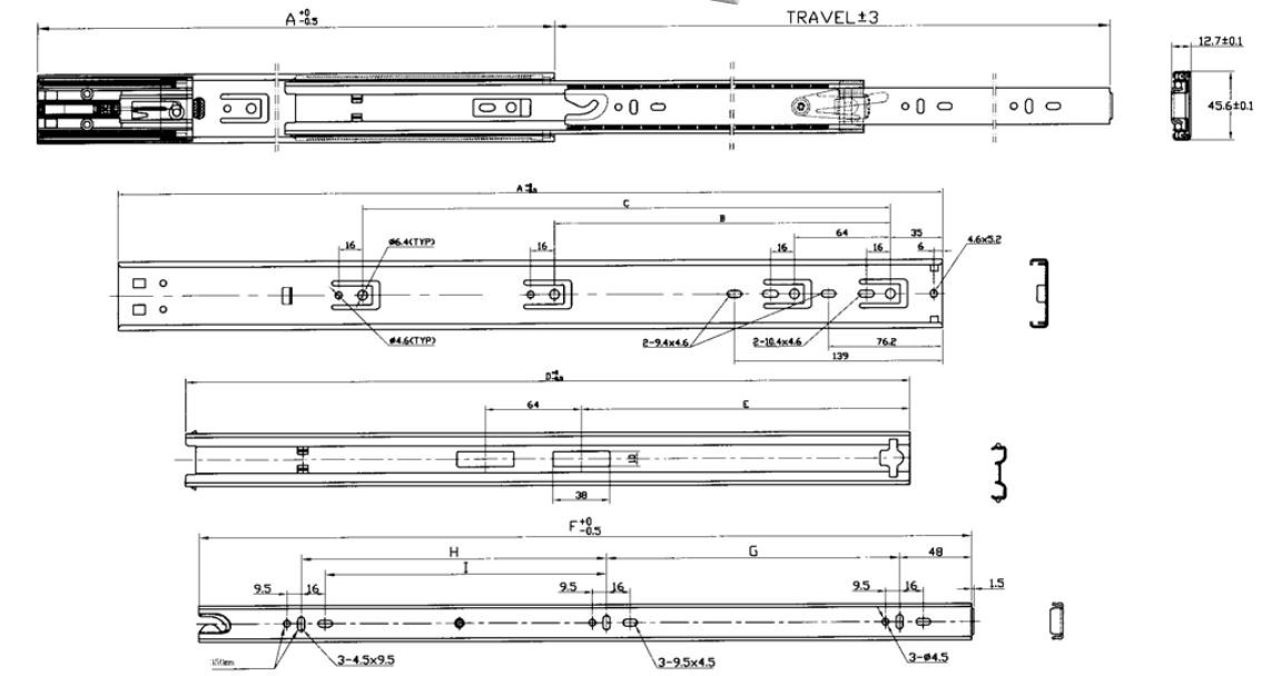 Inbouwdikte 12,7 mm per ladegeleider. De hoogte van deze ladegeleider is 45 mm.