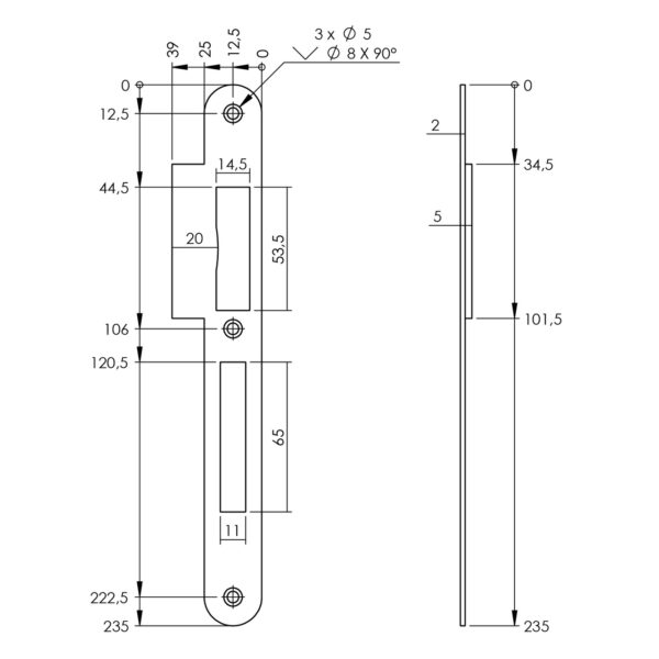 P+E Sluitplaat voor projectsloten met dag- en nachtschoot DIN rechts 235x25mm rvs geborsteld