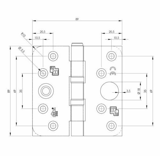 S2 veiligheidsscharnier kogellager 6512VH SKG3 ronde hoeken 89x89x2,4 mm rvs