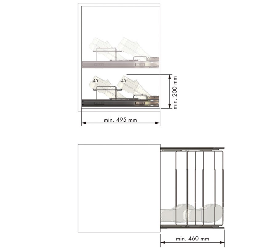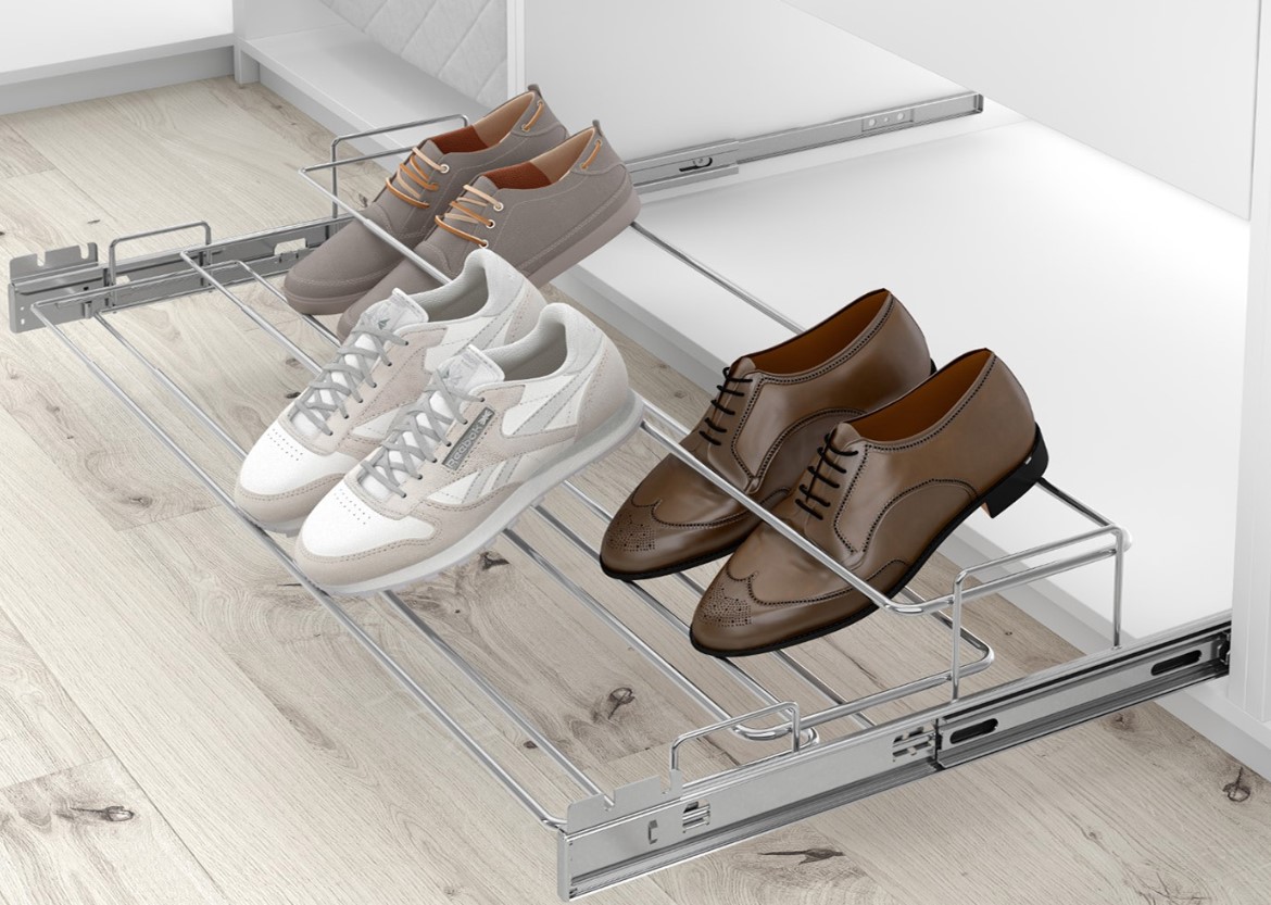 Dit volledig uittrekbare schoenenrek is gemaakt van verchroomd staal en in breedte verstelbaar van 640-1000mm. Het schoenenrek heeft twee etages en wordt geleverd met kogelgelagerde geleiders voor een soepele loop. Montage:Â tweezijdig opschroefbaar.