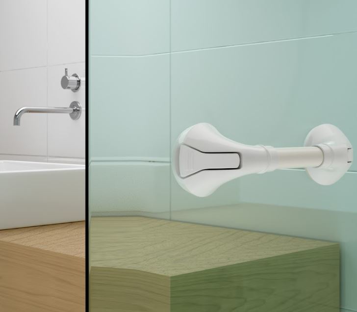 De beugel wordt door middel van twee vergrendelingen muurvast op de (gladde) ondergrond vastgezet. De rood/groene visuele indicatoren geven aan of de wandbeugel goed vast zit en blÃjft zitten. De greep is voorzien van een comfort grip voor extra houvast en is vervaardigd van corrosie bestendig metaal. De kappen zijn van slagvast ABS.