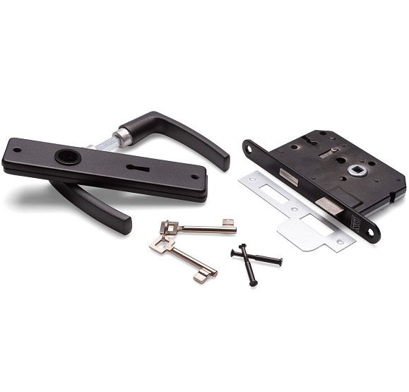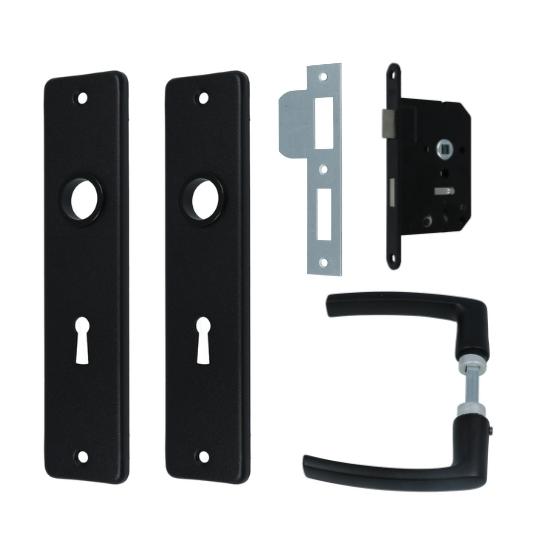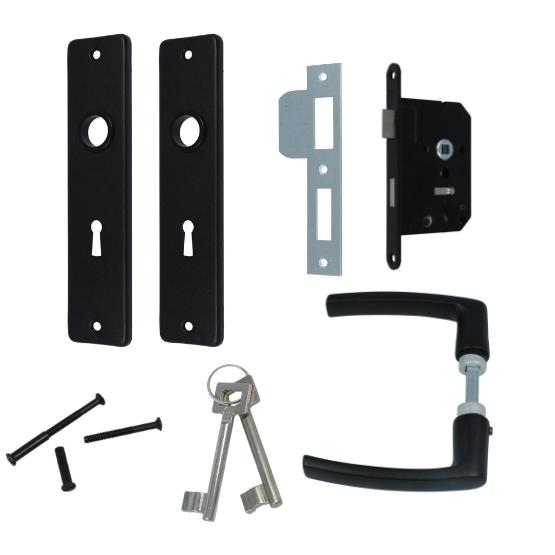 Dit is een complete set voor een binnendeur. De set bestaat uit een Dag en nachtslot met zwarte voorplaat, rechthoekige sluitplaat, patentboutjes t.b.v. deuren t/m 40 mm en een set aluminium deurklinken op schild met sleutelgat op 56 mm.