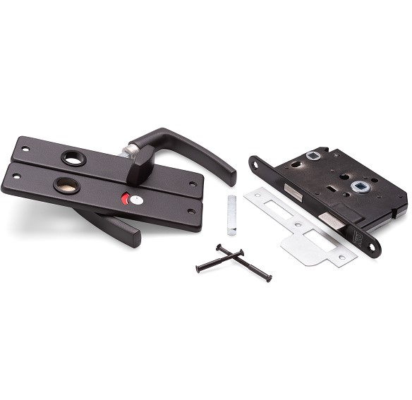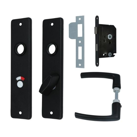 Dit is een complete set voor een binnendeur. De set bestaat uit een WC-badkamerslot met zwarte voorplaat, rechthoekige sluitplaat, patentboutjes t.b.v. deuren t/m 40 mm en een set aluminium deurklinken op schild met WC-sluiting.
