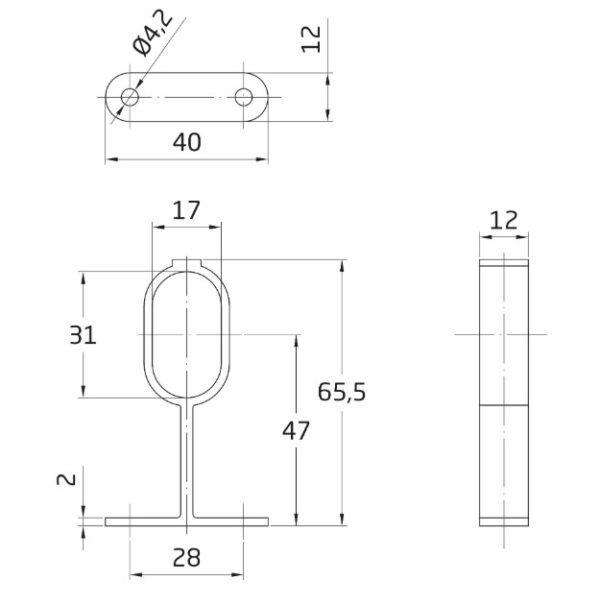Middenbeugel van hoogwaardig aluminium. Basis met twee schroefgaten voor bevestiging aan de bovenkant van de kast. De schroef aan de onderkant van de ring dient om de stang stevig vast te zetten en wegglijden te voorkomen. Zie gerelateerde producten voor bijpassende garderobestangen.