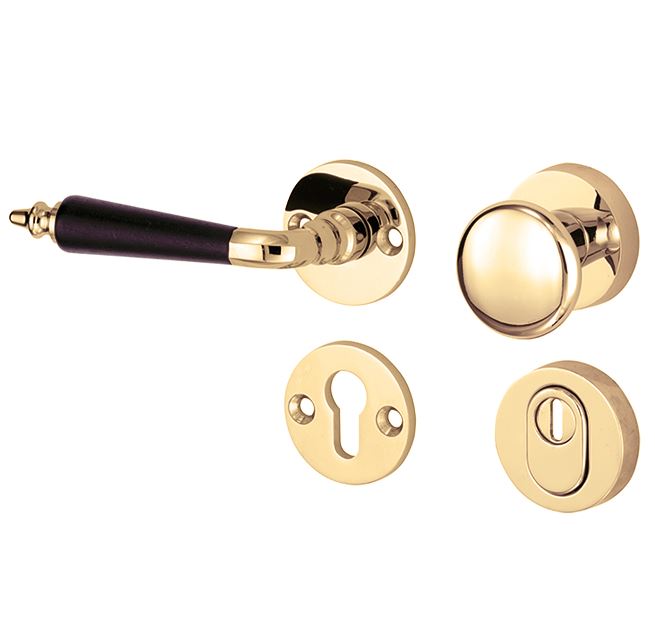 SKG3 knop/kruk op rozet Antique ebben links + kerntrekbeveiliging messing gelakt/messing PVD