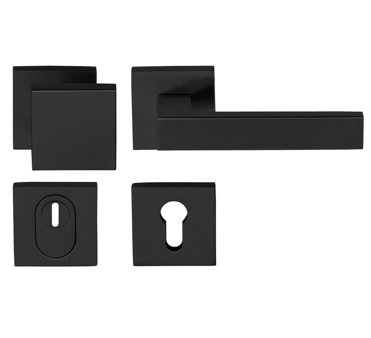 Quattro rvs/zwart veiligheidsbeslag knop/kruk met vierkante veiligheidsrozetten.