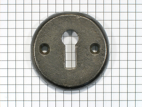 Sleutelplaat rond ijzer blank. Foto is genomen op ruitjes van 5 x 5 mm.