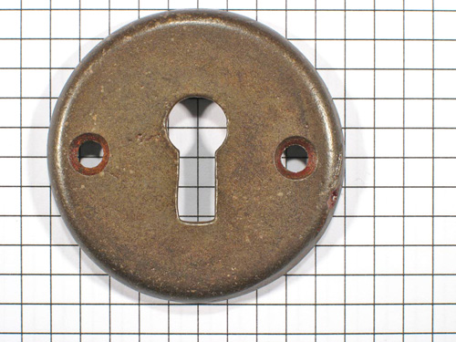 Sleutelplaat ijzer geroest rond. Foto is genomen op ruitjes van 5 x 5 mm.