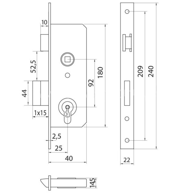 Insteek smaldeurslot, links en rechts omlegbaar, krukgat 8 mm, kruk-/cilindergat h.o.h. 92 mm, gegalvaniseerde voorplaat 240x22x2.5 mm.