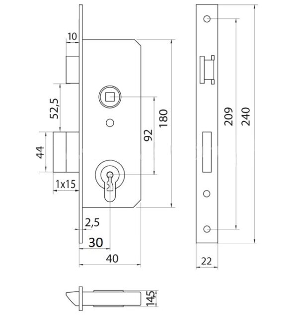 Insteek smaldeurslot, links en rechts omlegbaar, krukgat 8 mm, kruk-/cilindergat h.o.h. 92 mm, gegalvaniseerde voorplaat 240x22x2.5 mm.