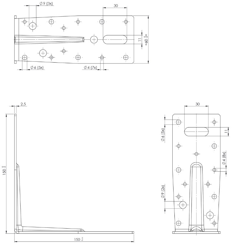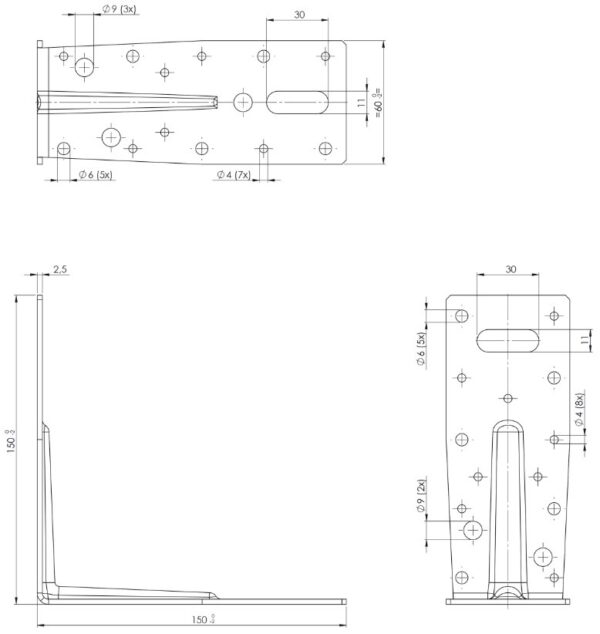 Met dit hoekanker, in de kleur zwart, maak je een houtverbinding in een hoek van 90 graden. Het hoekanker heeft een ril ter versteviging van de constructie en kan ook voor andere montage doeleinden worden gebruikt. De lengte is aan beide zijden 150 mm, de breedte is 60 mm en de dikte van het staal (sendzimir verzinkt) is 2.5 mm. Het slobgat is 30 x 11 mm.