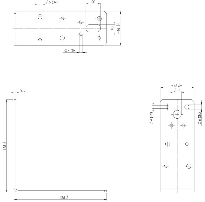 Met dit hoekanker, in de kleur zwart, maak je een houtverbinding in een hoek van 90 graden. Het hoekanker kan ook voor andere montage doeleinden worden gebruikt. De lengte is aan beide zijden 125 mm, de breedte is 46 mm en de dikte van het staal (sendzimir verzinkt) is 2.5 mm. Het slobgat is 20 x 10 mm.
