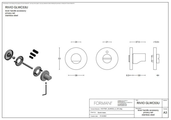 Deze toiletgarnituur is van FORMANI uit de serie RIVIO. Deze is ontworpen door Product Design Consultant Gensler. Deze wc-sluiting wordt geleverd inclusief 5/6/7/8 mm stift en rood/wit indicatie.