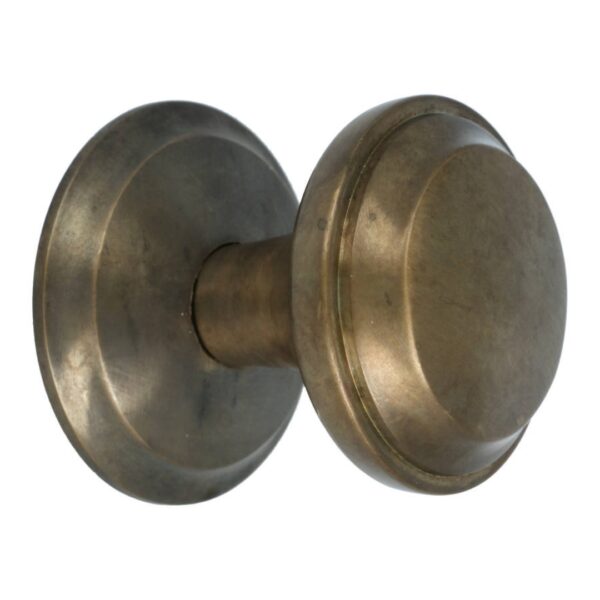 Voordeurknop op rozet. messing Antiek. De knop gaat met een M8 bout door de deur. Een ronde voordeurknop met rand dat tot antiek deurbeslag behoort. De messing deurknop is zowel geschikt voor de binnen voordeur als buitendeur en is met zijn bijzondere uitstraling een echte blikvanger. Het messing materiaal is van hoge kwaliteit en blijft, met het juiste onderhoud, jarenlang mooi. De knop komt op verschillende deuren erg mooi tot zijn recht.